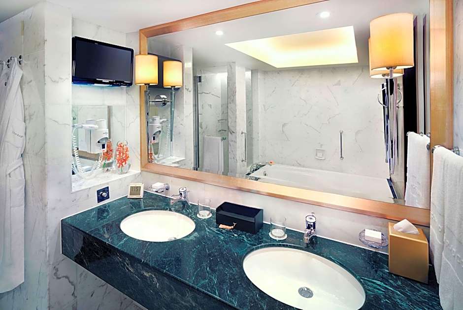Located from the 40th floor and above, guests can admire panoramic views of the stunning Hong Kong skyline from the comfort of this Deluxe guest room. The room offers twin beds and a TV. The elegant marble bathroom comes with a double sink, deep-soaking bath and separate shower and toilet. Other features include a workstation, tea/coffee making facilities and a fluffy bathrobe and slippers.